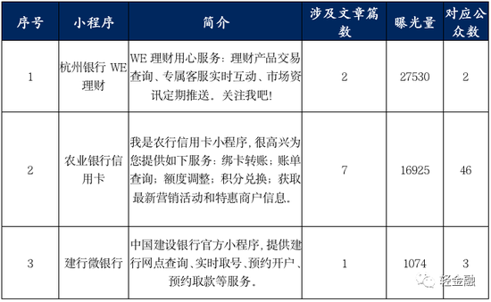 一是微信内各类工具相互协同不足。在微信公共流量增长放缓的情况下,私域流量增长成为关键,其中一个途径是微信各类工具相互协同,相互引流和承接,比如公众号于公众号之间,公众号和小程序应用结合等。但是从最近1周金融类小程序曝光前30位来看,只有杭州银行WE理财、农业银行信用卡、建行微银行3个小程序入榜,和公众号的数量和活跃粉丝明显不成比例,小程序和公众号的营销承接与协同明显不足。