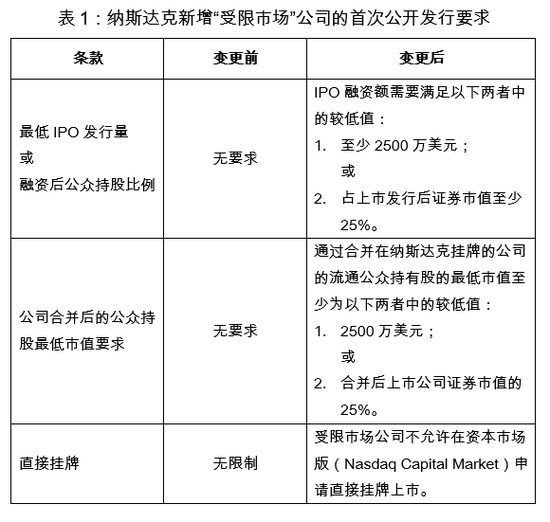 1. 增加对“受限市场”公司的首次公开发行要求(详情见表1);