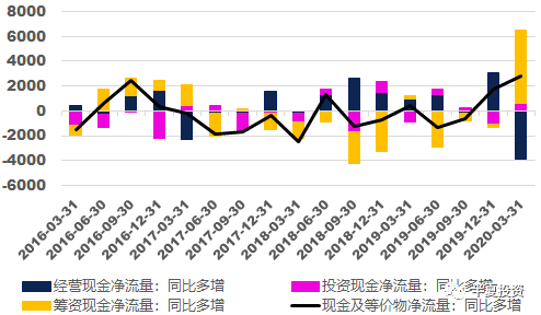 从非金融上市公司的现金流情况来看,筹资现金流大幅改善,完全抵消了经营现金流下降,使得企业的总现金流实现了过去3年以来最大幅度的改善。
