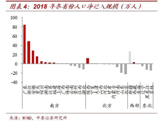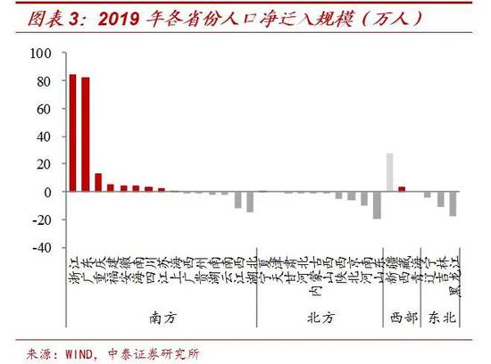 从具体省份来看,人口的流向变得更加集中。2019年浙江和广东人口净流入规模就达到了84.1万和82.6万,在全国层面遥遥领先。根据我们计算,70%以上的人口净迁入量都流向了浙江和广东,而前两年这个比例都只有60%左右。与其说人口流向了东部和南方省份,不如说是更加集聚地流向了广东和浙江两省,“二八”现象愈发明显。