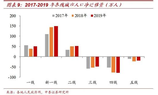 3、“抢人”愈演愈烈,新一线明显发力。从城市等级来看,一二线城市人口持续流入,三四五线城市人口在持续流出。18年“抢人”大战比较成功的安徽省和西安市,19年人口迁入规模明显放缓。核心城市都开始加入“抢人”队伍,未来中小城市的人口流出压力还会更大。