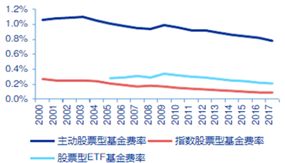 图2:2000-2017年美国各类股票基金费率:主动>ETF>指数