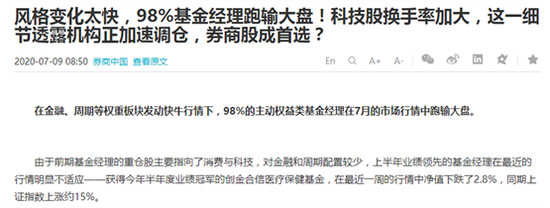 图:国内98%基金经理在7月跑输大盘的相关报道(来源:Wind)