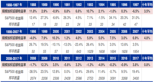 根据对所有在Bloomberg披露数据的面向美国国内销售的主动管理股票基金的统计,发现近十年主动管理股票基金整体超额收益明显弱化,1988-1997年、1998-2007年、2008-2017年,所有样本按规模加权的超额收益率10年均值分别为3.5%、4.8%、0.8%。此外,2003-07年、2008-12年和2013-17年期间,若以标普500指数为基准,所有样本基金的回报率跑赢标普500指数的数量占比的5年均值分别为76.8%、60.4%、43.7%,可见美国主动管理型股票基金跑赢S&P500占比在逐渐下降。