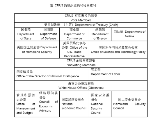 从成员看,CFIUS有9个投票成员机构,2个非投票成员机构,5个具有CFIUS案例相关专业知识的非成员机构,如白宫办公室等。