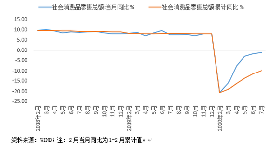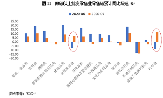 从具体商品类别来看,7月必需品零售额增速普遍放缓,粮油食品、饮料、日用品、中西药品等零售额同比增速较上月均有明显下滑。由于此前2-3个月上述类别商品零售额均呈现同比高增状态,故增速下滑后仍维持较快增长水平。7月可选消费品走势分化,同比增速较上月涨跌互现。当月石油及制品、房地产相关消费、服装表现较弱,化妆品、通讯器材增速放缓但仍处高增状态,汽车和金银珠宝增速则在上月剧烈下行基础上显著反弹。其中,7月汽车零售额同比增长12.3%,增速较上月加快20.5个百分点,与中汽协公布的7月汽车销量同比增长16.4%相一致。这主要受去年同期低基数拉动;另外,汽车促销政策频出、疫情下社交隔离催生新增购车需求等,也对汽车销售产生一定支撑。需要说明的是,在居民消费信心不稳定、整体消费需求较弱的背景下,各类别零售额增速在基数变动等因素影响下出现颠簸也属于正常现象,单月数据波动难以支撑趋势性判断。