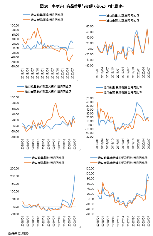 (5)7月钢材进口量同比增速飙升至210.2%,进口额增速也加快至58.8%;当月未及锻造的铜及铜材进口量和进口额同比增速较上月有所回落,但仍处81.5%和72.0%的高速增长水平。这一方面由于国内建筑链条景气度上扬,带动钢材、铜材进口需求明显好转,另一方面,由于国内经济恢复速度快于海外,造成铜材、钢材等部分工业品内贸价格高于进口价格,这进一步推升了相关商品的进口需求,甚至出现利用海内外价差进行套利的行为。