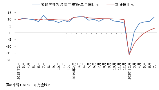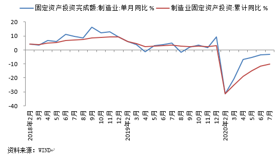 制造业投资:1-7月制造业投资同比-10.2%,比1-6月改善1.5个百分点。据我们测算,当月制造业投资同比降幅为-3.1%,仅较上月小幅改善0.4个百分点,是三大类投资中唯一继续处于负增长的类别,短板特征明显。其背后的主要原因是,制造业以民营企业为主,投资决策受行业利润走势影响较大,而且出口导向特征比较明显。近期以社零增长低迷为标志,国内终端需求不足,工业品价格(PPI)持续处于较深的通缩状态,这对制造业企业利润形成较大压力。另外,下半年全球经济仍将处于-4.5%的深度衰退状态,国际贸易整体呈较大幅度萎缩走势,我国出口韧性面临考验,也对当前企业投资信心带来一定抑制效应。不过数据也显示,疫情并未打断我国制造业转型升级过程:1-7月高技术制造业投资增长7.4%,其中,医药制造业、电子及通信设备制造业投资分别增长14.7%、7.3%。