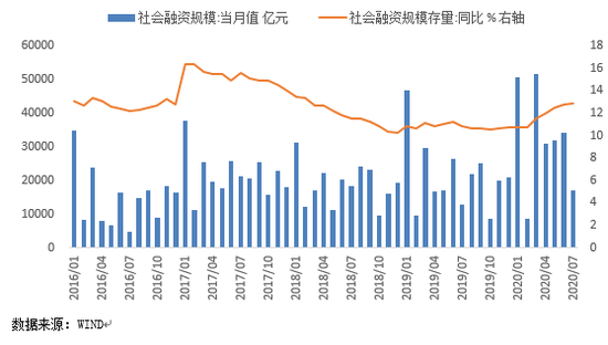 7月新增社融规模为1.69万亿,环比少增1.74万亿,除受人民币贷款季节性少增影响外,当月表外票据融资、政府债券和企业债券融资环比也出现较大幅度少增。同比方面,7月新增社融同比多增4028亿,带动月末社融存量同比增速较上月末加快0.1个百分点至12.9%,已为连续第6个月上升,但上行趋势明显放缓。7月社融同比多增,主要原因是投向实体经济的人民币贷款同比多增约2100亿,表外票据融资和委托贷款同比大幅少减,以及企业股票融资同比明显多增。当月政府债券、企业债券融资同比则较大幅度少增,信托贷款大幅多减。