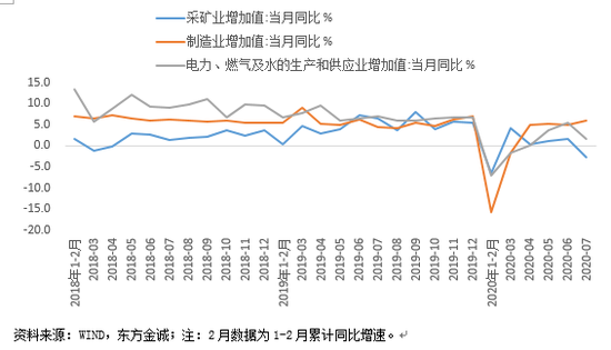 7月工业增加值同比增长4.8%,增速与上月持平,表现弱于预期,这与当月工业用电量同比下降0.7%相印证。从三大门类来看,7月工业生产未能如期加速的主要原因是采矿业、电力燃气及水的生产和供应业增加值增速放缓——其中,采矿业增加值同比转负,电力燃气及水的生产和供应业增加值增速较上月下滑3.8个百分点,这也反映于当月发电量同比增速回落4.6个百分点。不过,上月小幅放缓的制造业生产增速出现反弹,当月制造业增加值同比增长6.0%,增速较上月加快0.9个百分点。这一方面受去年同期基数走低影响,另一方面也反映了需求端投资增速进一步回升、消费需求缓慢修复,以及出口贸易在防疫物资出口和我国商品“替代效应”支撑下,保持较强韧性,对制造业生产的拉动。