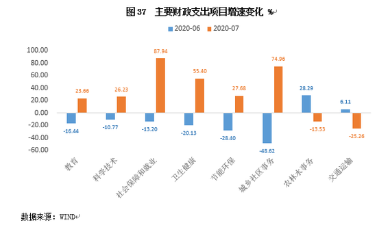 财政支出:财政积极发力,7月支出增速大幅转正,其中教育、科技、社保、卫生健康等民生类支出,以及城乡社区事务支出增速显著反弹。