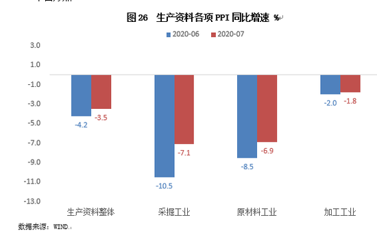 7月PPI环比延续上涨,涨幅为0.4%,与上月持平。主要受两方面因素拉动:首先,在OPEC+执行减产,美国页岩油产量收缩,各国逐步放松封锁、重启经济带动需求回暖,以及美元下跌等因素拉动下,7月国际油价继续波动回升。根据我们计算,当月布伦特原油现货价均值为43.5美元/桶,环比上涨8.2%。其次,7月国内工业生产进一步加速,投资、消费需求稳步修复,尤其是基建发力、地产保持韧性带动建筑链条景气度上扬,对工业品价格构成支撑。同比来看,在新涨价动能维持和翘尾因素拖累减弱——7月PPI翘尾因素为0.0个百分点,高于上月的-0.2个百分点——共同作用下,当月PPI同比跌幅较上月的-3.0%收敛0.6个百分点至-2.4%。