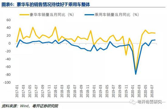 一是看大件可选消费——汽车。2018年二季度至今,多数月份的汽车销量同比是负增长的,市场各方对此也进行了很多讨论。但是我们看到,相同时期以BBA,即奔驰、宝马和奥迪衡量的豪华车销量同比增速,大部分时间都在两位数,销售情况要比汽车行业整体好得多。