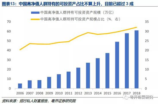 一是根据招商银行的私人财富报告,可投资产超过1千万的高净值人群,从2006年的18.1万人,增加到2018年的197万人。这些高净值人群持有的可投资产总规模,从2006年的5.2万亿,提高到2018年的61.0万亿,占全部个人持有的可投资产比例,同期从20.0%上升到32.0%。