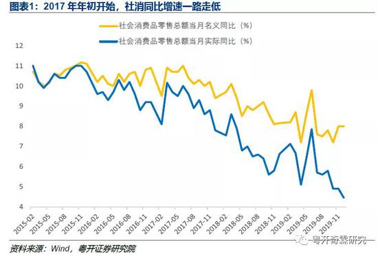 实物性商品消费方面,可以看到2017年年初开始,社会消费品零售总额名义增速就一路走低,剔除价格因素后,实际增速下滑得更快。