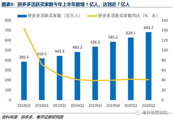 从活跃买家数看,连续五个季度增速在40%左右,有大量的新增买家开始使用拼多多。2019年年末时拼多多的活跃买家数为5.85亿人,到了今年二季度末的时候就涨到了6.83亿人。
