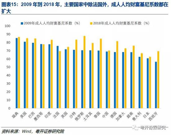 相比于收入,财富分化更大,也符合国际规律。2009年到2018年主要国家中除法国外,成人人均财富基尼系数都在提高。而且这些国家的成人人均财富基尼系数都在60%以上,远高于收入基尼系数,这意味着财富分化问题本身就比收入分化更严峻。