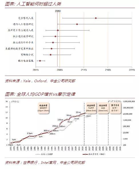 目前的人工智能技术属于弱人工智能,仅能实现语音识别、图像识别、和简单的自然语言处理等人脑功能中非常有限的一部分。随着人工智能的“智力”水平不断上升,逐步具备感知、语言、判断、记忆、情感、联想等人脑具备的功能,在未来将会替代越来越多的人类劳动。根据耶鲁大学和牛津大学的研究人员对352位人工智能专家进行了采访,人工智能到2060年前后有50%的概率完全超过人类[8]。另一方面,摩尔定律是过去50年支撑经济发展的动力之一,传统半导体工艺接近物理极限。量子计算被认为是在某些特定领域延续摩尔定律提升人类算力的方法之一,有望延续数字经济的繁荣。量子计算机是基于量子力学原理构建的计算机,量子计算机的计算能力随着量子比特(qubit)的增加呈现爆发式增长,形成所谓“量子优越性”。量子计算如果能够大规模商用,在大幅缩短新药开发、破解密码、以及搜索等人工智能应用所需时间。