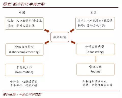 数字经济在中美,替代人和赋能人的程度并不一样,这跟中美的禀赋差异相关。美国数字经济的发展,更多的是机器替代人,通过资本深化替代就业。中国数字经济的发展,则更多的是机器和劳动力互补,对劳动力是友好的。美国的劳动力替代型数字经济体现为常规性、简单重复的工作,比如一些制造业流水线能被机器代替,同时甚至有一些不是很简单的、重复性的工作,也能够被机器替代。中国的劳动力互补型数字经济则体现在一些非常规的服务上,比如说外卖、送货员、专车司机、视频主播等等。