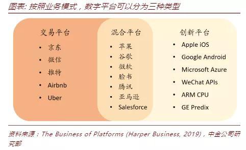 数字平台有不同的分类,根据业务的不同,数字平台大致可以分为三种类型:交易平台、创新平台以及两者结合形成的混合平台。