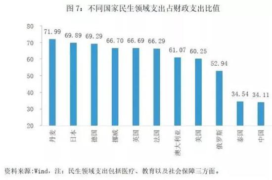 数据显示,发达国家的医疗、教育及社会保障三部分支出在财政支出的比重普遍达到60%以上。而中国目前的民生支出占比只有34%,尤其是社会保障和卫生投入方面,和发达国家相比差距较大。