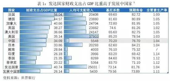 财政支出水平与居民生活水平联系密切,一个国家的财政支出在GDP中占比越高,其人均可支配收入相应也越高、预期寿命越长,贫富差距相对越小。数据显示,法国、德国、加拿大等财政支出占GDP的比重在40%以上发达国家,其人均可支配收入达到2.3万国际元,衡量贫富差异的基尼系数平均为74,平均预期寿命达到81.85岁。