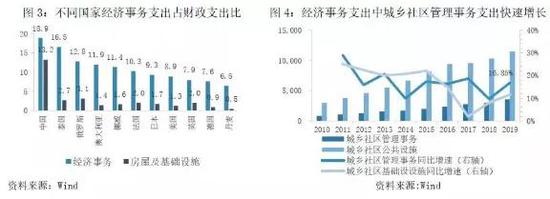 中国的财政支出结构中,经济建设支出与行政事务支出的占比较高,而经济建设支出中,城乡社区管理事务的增长最快,2019年增速16.85%,远远高于GDP的增速。