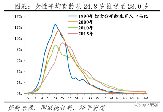 晚育现象也日益突出。1990-2015年女性平均初育年龄从24.1岁推迟至26.3岁,平均生育年龄(所有孩次)从24.8岁推迟至28.0岁。1990年主要初育年龄、主要生育年龄均为20-27岁,生育一孩数、生育子女数占比分别为86.6%、74.9%。而到2015年,主要初育年龄推迟至22-29岁,且生育一孩数占比降至66.7%;主要生育年龄推迟至23-30岁,且生育子女数占比降至59.1%。并且,1990-2015年30岁以上高龄产妇的生育一孩数占比从4.2%增至近19.2%,生育子女数占比14.0%增至32.3%。从2015年小普查数据看,生育一孩、二孩、三孩及以上的平均年龄分别为26.3、29.6、32.0岁,生育孩次数占比分别为72.0%、73.5%、69.5%。