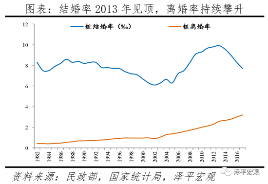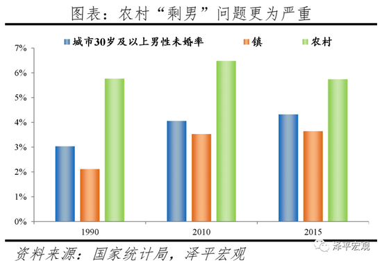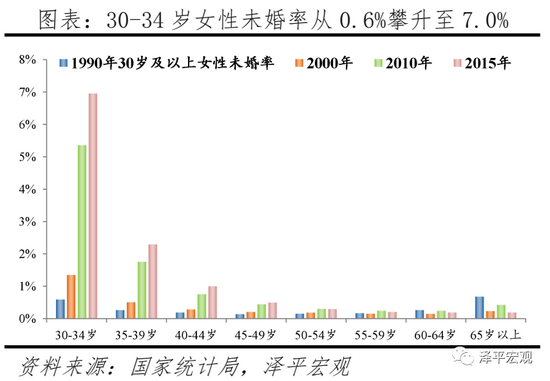 2)因婚姻市场匹配问题及单身主义等,“剩女”规模快速增加至约600万,学历越高“剩下”的概率越大。在婚姻市场中,女性多偏好不低于自身条件的男性,男性多偏好不高于自身条件的女性。这意味着即便婚姻市场男女性别比平衡,条件最好的女性和条件最差的男性也最有可能被剩下。1990年中国30岁及以上未婚女性仅为46万,2000年超过154万,2015年攀升至590万;其中,30-34岁女性未婚率从0.6%攀升至7.0%。从城乡分布看,2015年城市30岁及以上女性未婚率为2.4%,明显超过建制镇的1.0%、农村的0.9%。从受教育程度看,30岁及以上研究生学历女性未婚率高达11%,远高于本科学历及以下女性未婚率的5%。