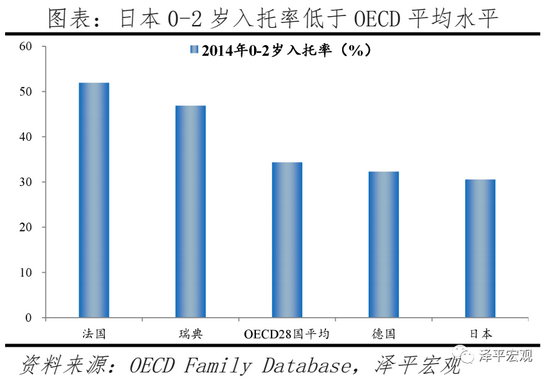 二是日本鼓励生育力度较弱,家庭福利开支占比仅1.6%,在OECD国家中排名倒数。根据日本国立社会保障和人口问题研究所,1980-2014年日本用于家庭的支出占GDP比重仅从0.47%上升至1.34%。根据OECD数据,2015年日本家庭福利开支仅占GDP的1.61%,低于OECD32国的平均水平2.40%,在OECD国家中排名倒数。在托幼方面,根据OECD数据,2017年日本0-2岁入托率仅为29.6%,低于OECD平均水平35.0%,且远低于法国的56.3%和瑞典的46.6%。