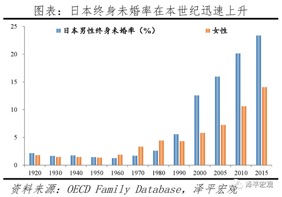 三是日本“男主外、女主内”性别分工较为普遍,职场性别歧视严重越来越多日本女性放弃结婚生育,1990-2015年50岁以上女性终身未婚率从4.3%激增至14.6%。与芬兰、瑞典等国将部分育儿养老工作社会化并由国家承担不同,日本的育儿养老责任多由家庭女性承担,将女性的角色定位为全职家庭主妇的思想仍然存在,“男主外、女主内”思想较为普遍。根据世界银行,2019年日本的女性劳动参与率达51.4%,低于OECD平均的51.5%;2019年日本男女劳动参与率差距达19.0个百分点,高于OECD平均的16.8个百分点。根据OECD数据,2018年日本的男女就业率差距为14.3个百分点,高于OECD平均的11.1个百分点;2016年日本的全职员工中男性和女性的收入中位数差距为24.6%,高于OECD国家13.5%的平均水平。越来越多的日本女性选择(暂时)放弃家庭,进入职场。根据日本国立社会保障和人口问题研究所,1990、2010、2015年男性终身未婚率分别为5.6%、20.4%、23.4%,女性分别为4.3%、10.6%、14.6%。日本社会已形成了一种不愿结婚和生育的观念,积重难返。