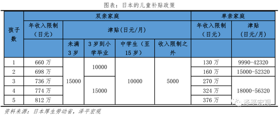 在经济补贴方面,日本生育女性可获得42万日元的一次性生育临时金、以及每月约1万日元的儿童补贴(12岁以下)。日本女性生产可以获得42万日元的一次性生育临时金,养育儿童可获得根儿童补贴。在收入限制内、抚养一个三岁以下的孩子的家庭,每个月可以获得15000日元的儿童补贴;抚养3岁到小学毕业的孩子的家庭,有2个孩子以内的每月可获得10000日元,3个孩子及以上的每月可获得15000日元等。