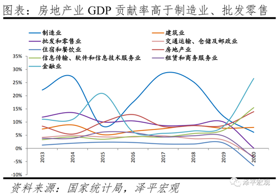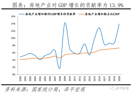 住房制度全面市场化以来,房地产业对经济增长的贡献率也在增加。2000-2020年房地产业对GDP增长的贡献率从4.8%波动增至13.9%。从时间点上看,在2009年、2016年和2020年,GDP增速降低而房地产业对经济增长的贡献率为14.2%、12.9%、13.9%,均高于平均水平。主要原因是,2009年我国在金融危机后经济增速回落,推出了“四万亿元计划”,为扩大内需取消了商业银行信贷规模限制,部分资金流入房地产业。2016年我国面临地方政府债务加剧、经济持续下行,采用降低购房贷款利率及首付比例等手段调控房地产市场,同时开始了房地产“去库存”计划。2020年面对疫情冲击导致的世界经济衰退,我国制造业、批发零售业产业增速受到影响,而房地产作为经济发展的对冲项,发挥一定作用。2020年制造业、批发零售业、房地产增加值增速为0.68%、0.04%、5.8%,前值为3.2%、7.6%、9%。