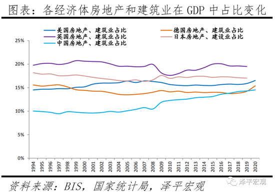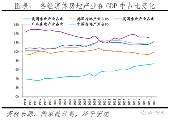 我国房地产业占比低估主要原因:其一,我国居民自有住房部分的增加值存在低估。以英国为例,居民自有住房部分增加值在全国GDP中占比9.2%。我国未公布居民自有住房增加值,但根据个别城市统计局数据,如石家庄、大连市的居民自有住房增加值仅占全市GDP中2.7%、3.5%,占比房地产业中66.5%、62.9%。其二,我国住房自有率高、租赁比例低。2000—2010年我国城镇家庭租房比例维持在21%左右,明显低于德国(55%)、英国(38%)、日本(39%)、美国(36%),因此租赁市场的贡献更低。其三,在房地产相关服务方面,发达国家多进入住房存量阶段,其物业管理、经纪与代理等服务更为成熟,贡献值更高。2019年英国房地产服务活动增加值为229.7亿英镑,占GDP的1.0%;我国虽未公布全国的物业管理及房地产中介服务增加值,但以石家庄、大连市为例,在全市GDP中占比分别仅0.3%、0.5%。