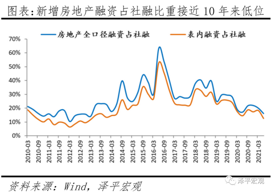从增量看,从新增房贷占比看,2021年上半年,金融机构新增人民币贷款中个人住房贷款的占比为16.8%,2020年全年占比22.3%,较2016年全年的38.7%有所回落,主要由于2016年以来政策引导房地产回归实体经济,实现“稳地价、稳房价、稳预期”的政策目标,弱化房地产投资属性。从新增房地产融资看,2010-2020年房地产全口径融资增量从2.5万亿增至6.8万亿,复合增速10.4%,其中主要的房地产贷款从2万亿增至5.2万亿,复合增速9.9%。房地产全口径融资增量占比社融增量从2010年的18%增至2016年的43%后,随着政策收紧下降到2020年的20%。