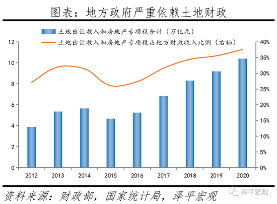 在土地财政制度设计中,地方政府依赖土地财政,房地产的直接税收及土地出让收入贡献可观。2020年土地出让收入和房地产专项税合计占地方财政收入的37.6%,地价占房价6成左右。