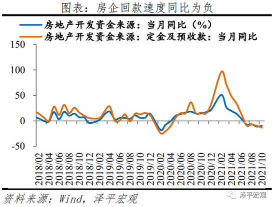 2、当前房企现金流风险是多种因素叠加的结果,部分房企债务过高、面临周期大拐点未能及时调整此前高杠杆策略,加之房地产销售快速下滑,三道红线、集中度管理、限购限贷等政策密集出台。房地产投资和销售连续6个月回落、负增长。10月商品房销售面积和销售额同比分别为-21.7%和-22.6%,分别较9月下滑8.5和6.8个百分点;房地产投资同比增长-5.4%,连续7个月下滑;土地购置面积和土地成交价款同比分别为-24.2%和-0.4%,分别较9月下滑22.1和21.6个百分点;房地产开发资金来源同比-9.5%,较9月回升1.7个百分点,但仍然低迷。