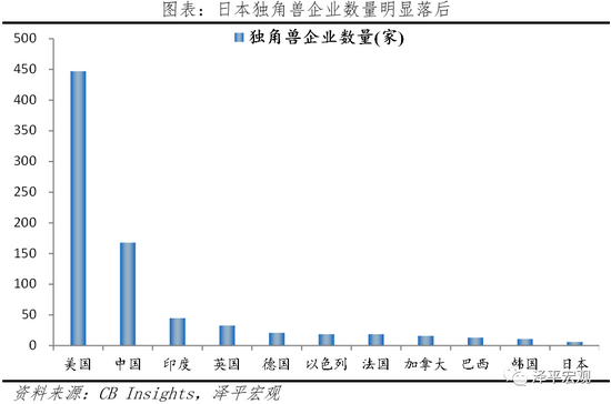 日本人口老化对科研资源产生挤出效应,叠加曾经长期实行终身雇佣制及年功序列制限制年轻人创新意愿,导致日本错失第三次信息技术革命机会,独角兽企业数量仅6家。一方面,日本老年人占比持续上升,政府、企业用于老龄化的支出增加,科研资源投入相对减少,从而不利于技术创新。另一方面,尽管终身雇用制与论资排辈的年功序列制已逐渐崩溃,但两种制度长期实行对日本科技创新产生长久的消极影响,企业组织过于冗余,难以淘汰低素质劳动力;高素质劳动力由于晋升慢、薪资低,创新意愿受挫。老龄化对科研投入的挤出效应,叠加制度因素限制年轻人创新意愿,使日本错失第三次信息技术革命机会,独角兽企业数量仅明显落后。根据CB Insights数据,截至2021年10月,日本独角兽企业数量仅6家,大幅落后于中美印英德韩的168、447、45、33、21、11家,且估值均小于20亿美元。