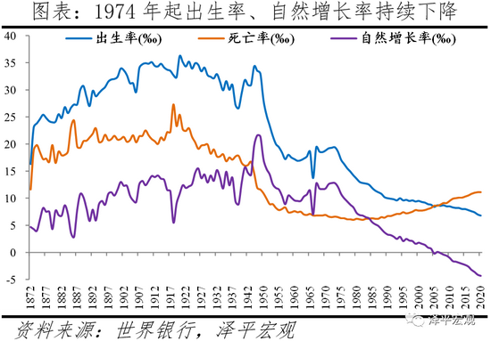 3)低出生、低死亡、低增长阶段:二战后日本长期控制人口,政策缺乏前瞻性,错失应对人口问题最佳时机,1947-2020年人口出生率由34.3‰降到10‰以下,自然增长率由正转负。1947-1949年由于士兵归国扎堆结婚生育,日本迎来“团块世代”婴儿潮,出生率出现34.3‰的小高峰。1949年起政府开始出台节制生育、控制人口的政策,政策导致日本人口快速转型至低出生、低死亡、低增长,出生率在短短5年内由30‰降至20‰,远低于其他发达国家15-40年的时间。1955-1974年由于“团块世代”婴儿潮在20-30年后出现回声婴儿潮,出生率小幅增长,总和生育率小幅下降,到1974年总和生育率已降至世代更替水平。然而日本政府缺乏前瞻性,忽视了生育率进一步下降的内在趋势和强大惯性,1974年仍提出“把静止人口作为日本发展目标”,直到1989年总和生育率下降到1.57时才放松人口政策、推出支持生育措施,错失了应对问题的最佳时机,叠加90年代泡沫破裂,人口出生率、增长率下降问题已积重难返,1974-2020年出生率由18.6‰降至6.7‰,自然增长率2005年由正转负,但由于移民迁入,总人口2008年达到顶点后减少。