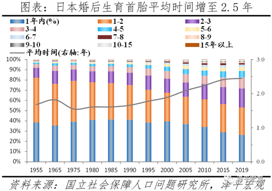 生育成本提高、预期收入下降导致日本适育人口“不愿生”、“不敢生”,进而不婚化、晚婚化、婚后不育晚育加剧,从而使总和生育率长期低于1.5,陷入“超少子化”困境。一方面,随着女性教育水平提高,女性劳动参与率上升,生养育时间减少;同时70年代经济高速发展提高了工资水平,女性为生育而放弃劳动报酬的机会成本随之增加,导致“不愿生”。另一方面,90年代起经济长期低迷导致年轻人预期收入下降,而政策补贴杯水车薪,经济问题导致“不敢生”。从结婚率看,日本结婚率1947年见顶下降,1972年反弹至10.4‰后持续降至2020年的4.8‰;与之相对的是终身不婚率的持续攀升。从结婚年龄看,晚婚现象加剧,日本男性、女性初婚年龄显著增长,影响生育子女数量。1970年20-29岁初婚的男性占结婚男性总数的84.2%,2019年这一比例降至50.4%。从婚后生育率看,婚后不生孩子、晚生孩子比例上升,1975-2019年婚后一年内生孩子的女性占比从39.4%降至26.2%,婚后生育首胎平均时间从1.6年增至2.5年。不婚化、晚婚化、婚后不育及晚育导致日本总和生育率持续下降,1974年日本总和生育率低于世代更替水平进入少子化时代,1992年降至1.5掉入“低生育率陷阱”、陷入“超少子化”困境,2020年总和生育率仅1.34,低于OECD高收入国家的1.60;0-14岁人口占比12.0%,低于OECD高收入国家的16.3%。
