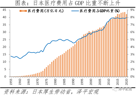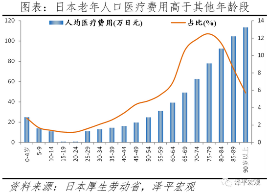 日本人口抚养比高于所有发达国家,社保给付费占GDP的22.1%,然而来自劳动人口的社保财源缩小,政府财政压力加剧。从人口抚养比看,2020年日本人口抚养比(15岁以下和65岁及以上人口占劳动年龄人口比重)较1960年增长1.2倍,在发达国家中居首位,其中老龄化带来的老年抚养比增速高于少子化带来的少儿抚养比降速,1960-2020年老年抚养比、少儿抚养比年均复合增速分别为2.9%、-1.3%。从社保给付费看,抚养比的增长导致社保给付压力增大,根据厚生劳动省数据,2019年日本社会保障给付总额占GDP的22.1%。然而社保给付费的财源55.9%来自企业及劳动人口,受益对象却是老年人口,以医疗费用为例,各年龄段医疗费用呈现两边高中间低特征,65岁及以上人口人均医疗费是劳动年龄人口的4.9倍。随着劳动人口减少,来自劳动人口的社保财源缩小,而老年人增长又使社保支出膨胀,政府财政压力加剧。从财政负担看,日本政府负担社保费用的比重自90年代起不断增长,1991-2019年政府负担比例由24.4%升至39.2%;同时日本面临由此导致的严重的财政赤字,2020年政府债务占GDP比重高达234.6%,远高于发达国家60%的警戒线。