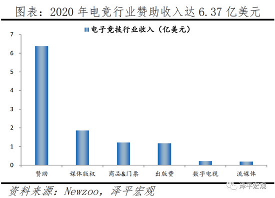 从电竞市场收入看,2020年全球电竞总收入达到11亿美元,中国市场份额最高,占全球总收入的35%。报告显示,目前全球电竞市场的最高收入来源为赞助商赞助,2020年赞助收入达6.37亿美元,占全球电竞总收入的57.9%;其次为媒体版权,占比为16.9%(1.85亿美元);商品和门票最为第三大收入来源,占比为11.1%(1.22亿美元)。