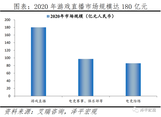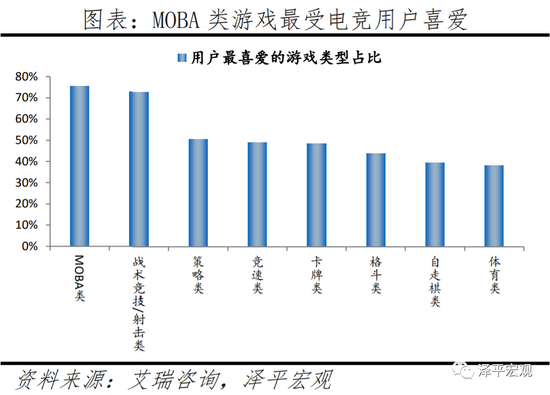 从电竞生态市场看,2020年中国电竞赛事、俱乐部及相关市场规模近100亿元,目前中国举办MOBA类电子竞技赛事占比超50%,高于FTP射击类(30%)和卡牌类(19%)。从电竞赛事市场规模看,根据艾瑞咨询《2021年中国电竞行业研究报告》,2020年电竞赛事、俱乐部及相关市场规模达97亿元,在中国电竞生态市场中占比约为25%,其余细分市场为游戏直播市场(180亿元)和电竞陪练市场(86亿元),据Newzoo《2020全球电子竞技市场报告》显示,中国有5.30亿人口关注电竞,拥有全球规模最大的电竞用户群体。从举办的赛事类型看,目前我国电子竞技开展的赛事是以三大类型为主,MOBA类(英雄联盟、DOTA2等)占比最大,达51%;FTP射击类(穿越火线、绝地求生等)占比30%;卡牌类(炉石传说等)占比19%。电竞成为年轻一代最喜欢的娱乐社交方式之一,在电竞人群中,超过80%的年轻群体更喜欢电竞相关内容。(MOBA类游戏为多人在线战术竞技游戏,一般都会采用5V5的模式,地图中有3条兵线,并且连接双方主基地,沿途中会有不少的防御塔,获胜的唯一方式就是摧毁对方主基地,玩家在游戏中所控制的单位则称之为英雄,在摧毁对方基地的过程中击杀敌方英雄可以获得充分游戏体验。)