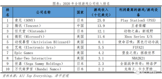 2.3 2020年,全球十大游戏公司:索尼居首,美国公司占据5席,中国仅一席