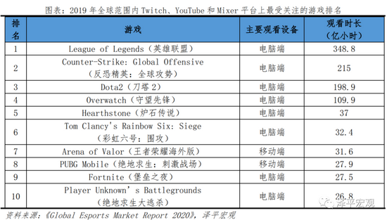 从电竞游戏观看热度看,2019年用户观看英雄联盟直播的时长近350亿小时;主要通过电脑端进行观看。根据Newzoo《2020全球电子竞技市场报告》显示,按照电竞直播时间内的观看时长统计,2019年全球范围内Twitch、YouTube和Mixer平台上最受关注的游戏排名中,《英雄联盟》位居榜首,电竞直播时间观看时长为348.8亿小时。从观看方式看,用户主要通过电脑端进行观看,用电脑端观看前10大最受关注游戏直播占比达80%;通过移动端观看,占比仅20%。