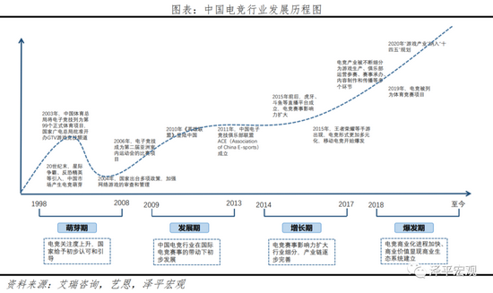 1998年至今,中国电竞行业从互联网普及和国外电子游戏引入发展为具有体育化、技术化、商业开放化