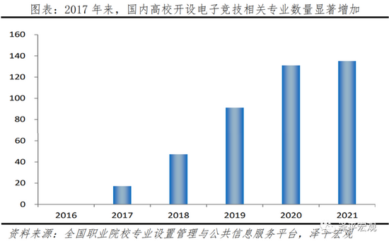 中国电竞人才培养机制渐完善,2017-2021年开设电竞相关专业高校数量增长7.9倍,但在组织管理与人才输出上不及韩国;2020年人才缺口达50万。从培养体系演进看,培养机制以高校及电竞厂商为核心逐步完善。高校端,2016年教育部增补电子竞技运动与管理专业,2017-2021年开设电子竞技运动与管理专业的高等职业学校数量从17所增至135所。电竞厂商端,厂商通过举办大众业余赛事选拔大众晋级至职业赛道,此后利用俱乐部青训体系培养顶级选手。从培养机制对比看,中国人才培养体系不及韩国。组织管理上,韩国1999年成立韩国职业电子竞技协会统一负责电竞赛事举办、保障电竞选手权益等,而中国缺乏统一的管理组织;人才输出上,韩国因其培养的电竞选手素质高已成人才输出国,而中国仍处人才引进阶段。从人才缺口看,中国电竞人才需求不断扩张,然而受传统社会观念、产教不融合影响,行业人才供给匮乏。根据《2020年全球电竞运动行业发展报告》,2020年初我国电竞从业人数仅5万人,人才缺口高达50万,其中电子竞技运营师较匮乏。根据《2019年度中国电竞人才发展报告》,47.8%的电竞从业者认为经营管理类岗位最缺乏人才,其次为公关/市场类、赛事制播类、技术服务类。然而根据企鹅调研平台数据,2020年希望就职于内容制作、数据公司、赛事执行的用户占比较2019年出现零增长甚至负增长。