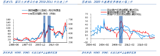 2009年之后的产出缺口扩张,主要是“四万亿”投资计划带动的。2009年固定资产投资完成额、基建投资完成额分别同比+30.4%和42.2%,而资本形成占GDP比重在2010、2011年站上了47%的历史高位。这一时期产出缺口仍在零以上,但已出现收窄趋势,CPI同比达到阶段性高点之后快速回落,PPI同比甚至出现了连续五年的通缩状态,产能过剩的迹象越加明显。