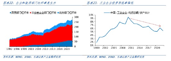 随着M2/GDP提高,我国实体经济部门宏观杠杆率也在提升,2022年升至273.2%的高位。观察历史数据,宏观杠杆率与物价之间存在较明显的负相关关系,杠杆率增速放缓时物价涨幅较大,杠杆率快速上升时物价反而下行。究其原因,经济中的私人部门已经因高债务而持续性变差,目前经济已经不再是债务推动型的经济扩张时期,而是债务缩减型的经济收缩时期。虽然政府部门以及国有企业部门正在加杠杆,但私人部门更愿缩减债务,消费和投资意愿依然较低。