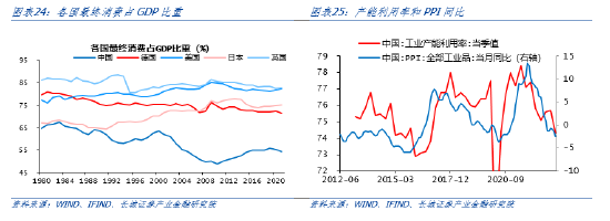 而与此同时,我国仍在加大投资力度,既要求提高投资增速又加大政府投资。实际上我国投资比例已经过高,这一方面会造成经济资源的浪费,投资品产能利用率和投资回报率持续降低就是证据之一;另一方面也会对消费形成挤压,进一步加剧有效需求不足。我们用工业企业利润总额占资产比重大致衡量投资回报率,从2010年的最高9.3%降至2022年的5.4%,投资回报率持续回落。当前我国资本占GDP比重依然偏高,消费支出占比仅54.5%(2021年),远低于我国80年代的高点64%,也远低于欧美日韩等发达国家。